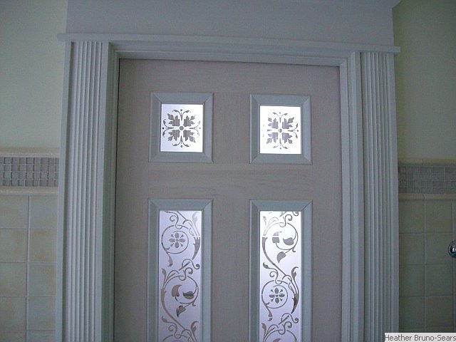35  Series of Built-in Ornamental Reverse Gilded Etched Glass Panels for an Entrance Foyer Alcove 36  Etched family monogram for last name in glass panel & frosted effect via etching concealed contents of television stand. 37  Work in progress - weeding decorative masking pattern used to create ornamental etched glass panels on 2 doors for a Victorian style home. 38  Ornamental etched glass detailing on a pair of front doors for a Victorian style home in Skaneateles, NY. 39  Ornamental etched glass table top for a breakfast nook. 40  Ornamental Etched Glass Plantation Shutter Inserts; Allows Filtered Light w/ Privacy 41  Detail - Ornamental Etched Eyebrow Window @ Heather's Circa 1814 Schoolhouse Studio Showroom
